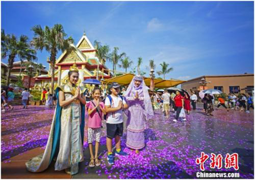 據(jù)介紹,方特東盟神畫讓游客不出國門,一站式“打卡”東盟十國。其中,《相約下龍灣》以參觀越南郵票展的形式,游客通過無軌跡尋跡游覽車跟隨主角一起感受當?shù)靥厣霞小⒚麆俟袍E;《塔鑾盛典》則運用360度巨型環(huán)幕呈現(xiàn)了老撾象征千年塔鑾寺的建設歷程和歷史變遷;《千島之歌》主要以程控魔球、魔幻舞臺和經(jīng)典演藝等形式,為游客呈現(xiàn)印度尼西亞獨有的節(jié)慶文化和民俗風情;《馬六甲勇士》通過大型漂流河道、水幕電影、海嘯災難模擬、虛實場景相結合,為游客講述了馬來西亞民族英雄漢都亞大戰(zhàn)海盜的傳奇故事。