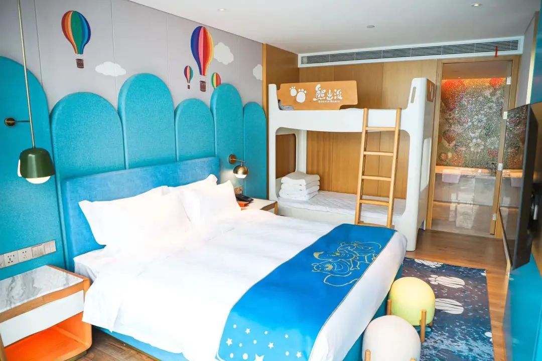 今年4月,全球首家熊出沒酒店落戶天津,酒店將國際先進設計理念與熊出沒元素相融合,4萬平方米面積內設有299間風格各異的特色客房與兒童娛樂區、spa房、健身房等娛樂設施,滿足不同游客度假、消費、會議、休閑的多樣化需求。