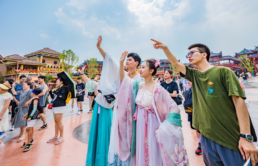 園區內各類主題商店也吸引了大批游客光顧。方特官方正版文化產品、獨有的“熊出沒”IP周邊廣受孩子們的歡迎;深度融入傳統文化內容的國潮文創產品,同樣吸引了眾多年輕游客選購。