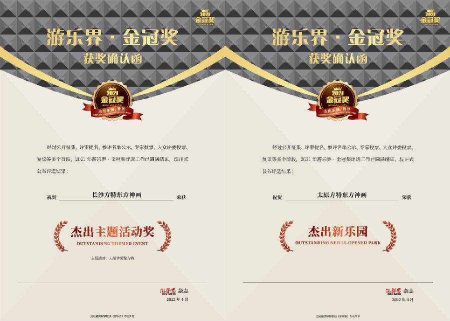 近日,由《游樂界》雜志主辦的2021年度“金冠獎”發布獲獎榜單,華強方特集團旗下大型高科技主題樂園“太原方特東方神畫”和“長沙方特東方神畫”,分別獲得“中國杰出新樂園”和“杰出主題活動獎”。