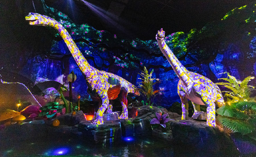 在大型室內河道漂流項目《河谷探秘》中,游客乘坐漂流船緩緩駛入恐龍河谷,穿越瀑布流水、植被茂密的雨林秘境,近距離接觸眾多恐龍和原始生物族群。神秘的河谷氛圍,有趣的恐龍互動,引發現場游客陣陣驚呼。