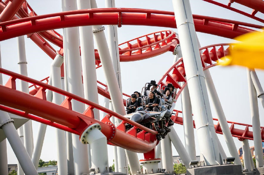 除此之外,新型彈射式過山車項目《鷹擊長空》外觀與航母造型高度相似,引得體驗官們拍照不斷?!傲阒亓ΨD”“360°回旋”等16種模擬戰機的空中高難度動作以及最高時速92公里的彈射體驗,更是讓現場游客狂呼過癮、尖叫不斷。