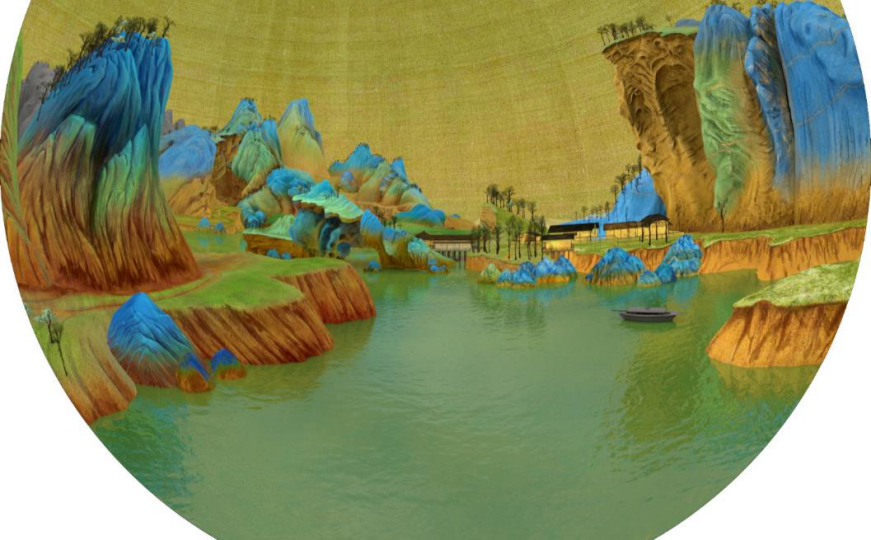 《千里江山圖》作為一副山水畫,少不了大量的水面場景。直接使用傳統的中國畫形式去模仿畫中水的線條感,難以達到青綠通透的效果;方特的數字藝術家們敏銳地選用了中國玉的質感,采用寫實和中國畫兩者結合的方式,用溫潤美玉的微妙光澤來表現出江河湖泊的水。這是一次全新的嘗試,也是一次成功的創新。