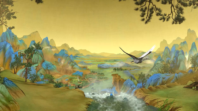 我想到宋徽宗有一幅著名的作品《瑞鶴圖》,于是就加入了“仙鶴帶領觀眾飛翔”這一創(chuàng)意,在影片一開始首先展現(xiàn)了《瑞鶴圖》的畫面,進入北宋的宮殿,隨后的飛翔鏡頭就是模擬仙鶴的視角,飛入畫中引領觀眾一路飛翔。這個創(chuàng)意很重要,它串聯(lián)了三個關鍵要素,一是仙鶴引領觀眾飛翔,強調(diào)了方特球幕飛翔影院的特點;二是《千里江山圖》,這幅畫本身沒有仙鶴,但是翩翩白鶴飛翔在青綠色調(diào)的千里江山中,江山因此而變得生機勃勃;三是帶出了宋徽宗這一歷史人物,他是《千里江山圖》的指導老師,十分喜歡仙鶴。所以仙鶴的創(chuàng)意貫穿影片始終,使整個故事更加完整,主題更加突出。