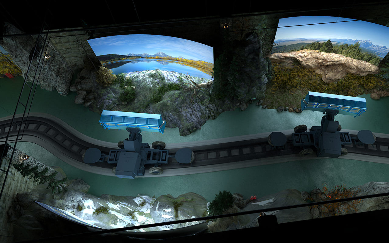 抓舉式動(dòng)感軌道車項(xiàng)目采用大型搖臂軌道車、球幕與環(huán)境場景相結(jié)合。其中軌道車輛采用了抓舉式多自由活動(dòng)的技術(shù),可以根據(jù)劇情做出旋轉(zhuǎn)、上升、下降等多個(gè)動(dòng)作,可以模擬很逼真的飛翔感。